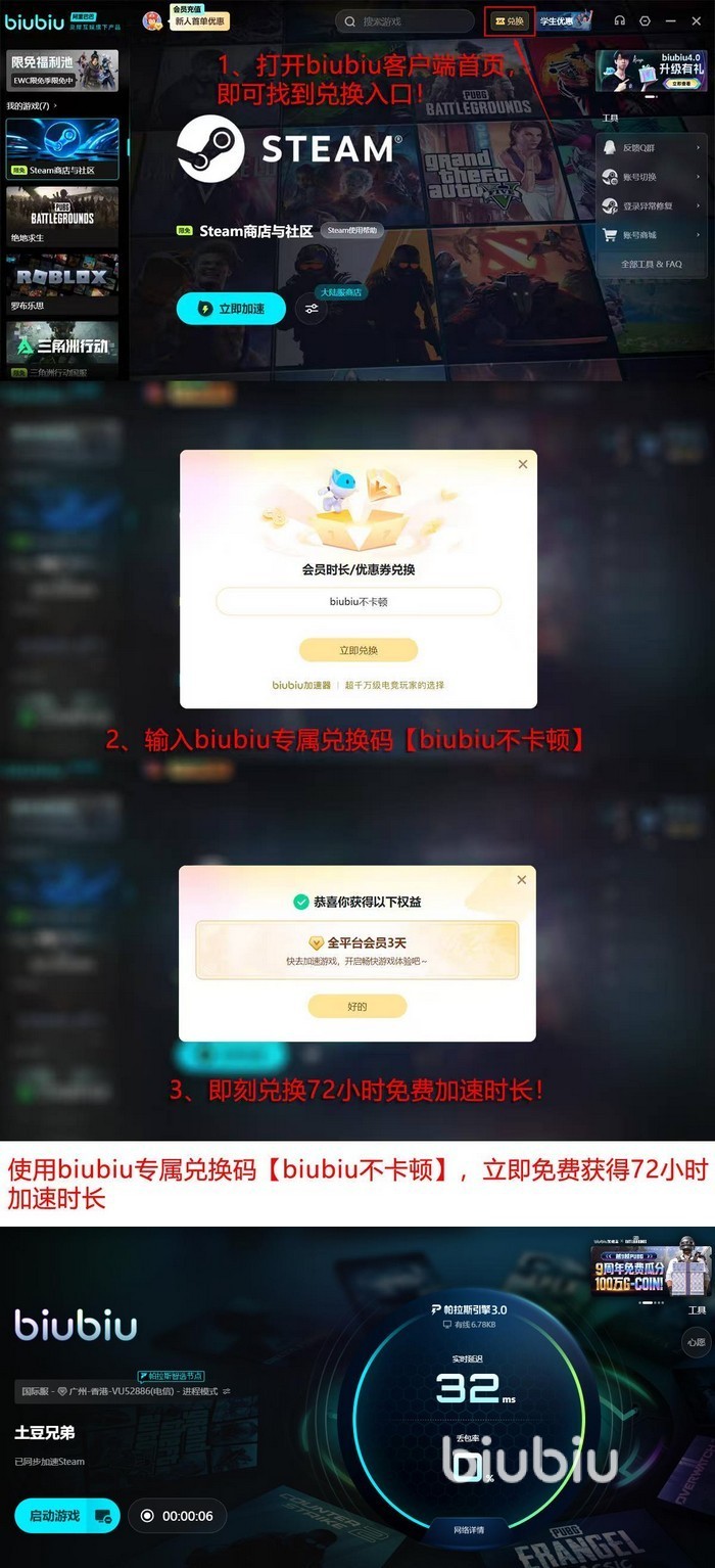 好的产品自然是值得检验的,biubiu有这个底气,所以直接给到最多4天的体验时长,使用口令“biubiu不卡顿”即可换取3天的全平台会员,在这一基础上完成注册的新用户还能自动获取24小时免费体验时长,这样的话新人就是足足96小时了。