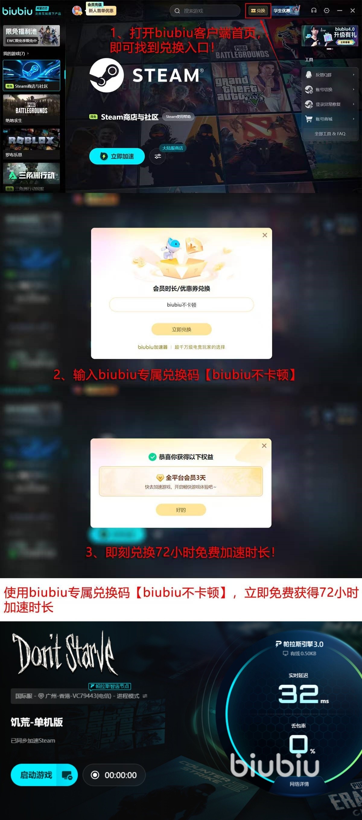 现在针对于所有用户都推出非常贴心的福利,如果是新人在注册登录之后,即可成功获得24小时免费加速时间,不管是新老用户,第一次输入【biubiu不卡顿】可以拿到72小时,新人可以将两项叠加,累计享受长达96小时的高质量加速服务。