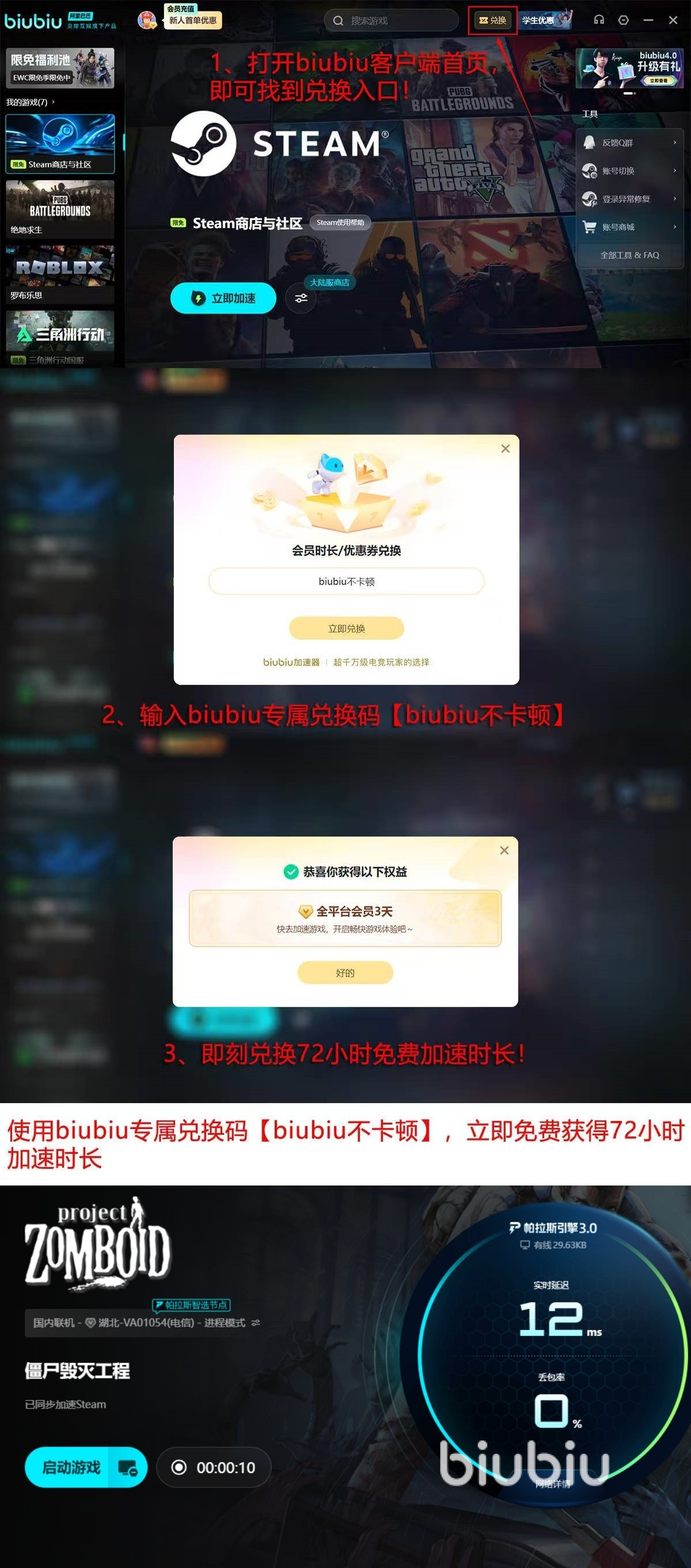 现在全新注册用户有福利,系统直接给到24小时通用加速时长,再通过“biubiu不卡顿”额外拿到3天免费会员加速权益,总体叠加可得到96小时无门槛体验,大多游戏都可尝试加速效果。