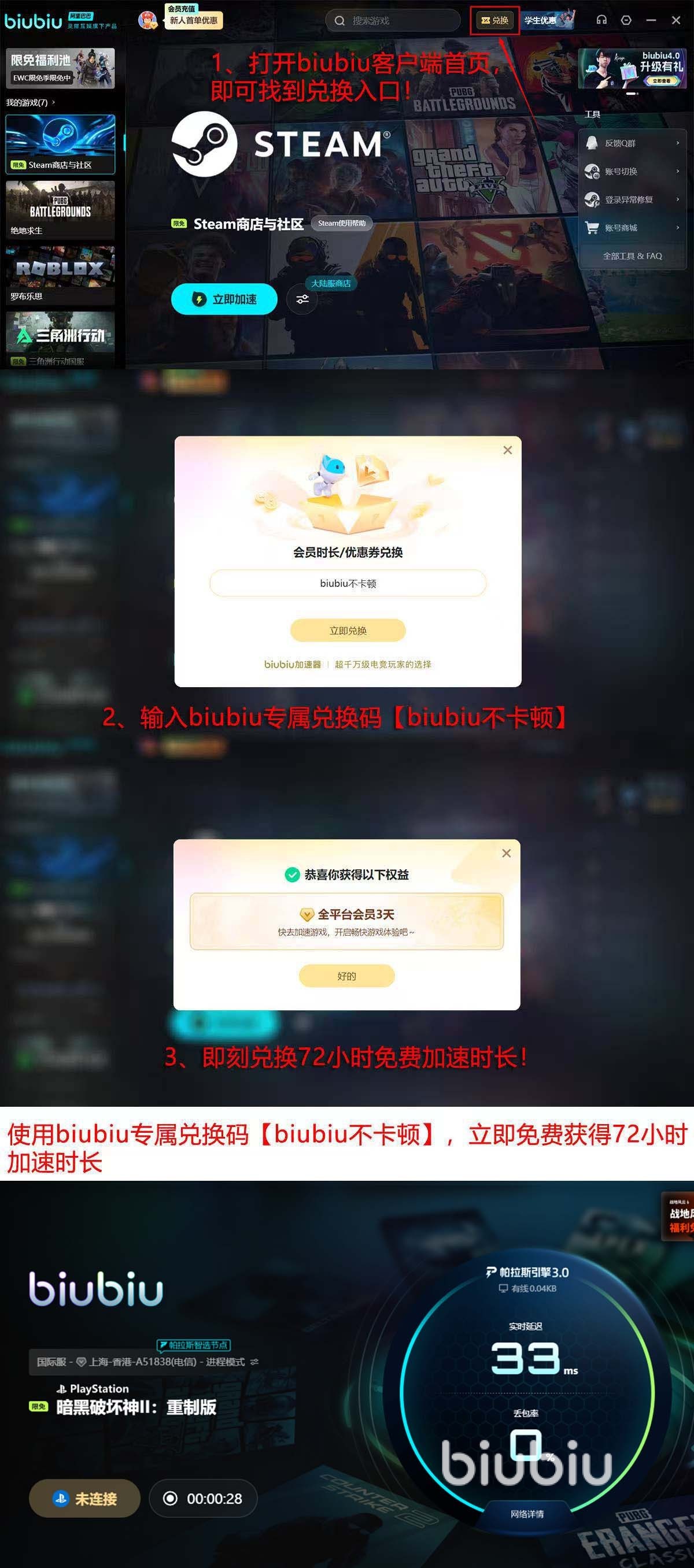 当大家玩暗黑2的时候,对网络不满意的时候,可以先领取几天免费试用时间,测试一下biubiu加速器的加速效果。领取时间有两个,一个是注册账号时系统送的24小时,另外一个是完成登录后,打开首页上的“兑换”功能,输入【biubiu不卡顿】口令后,就可以再得到72小时,总共时间有96小时。
