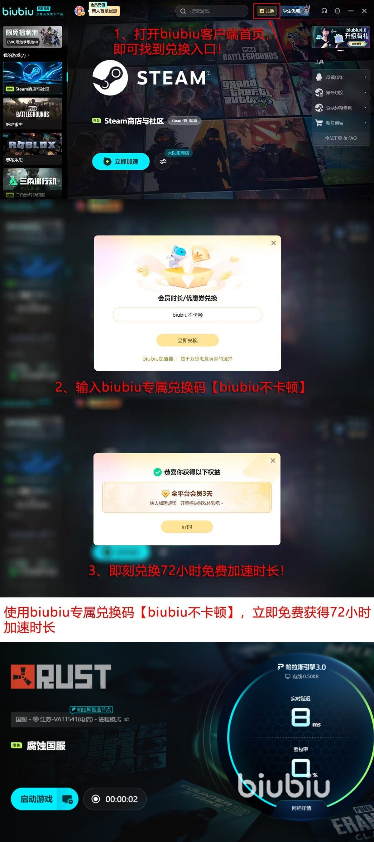 全新用户注册,即刻获赠24小时加速时长,全新兑换码“biubiu不卡顿”额外获取72小时全功能加速,不仅该游戏能加速,其他正在体验的游戏也可尝试免费加速。
