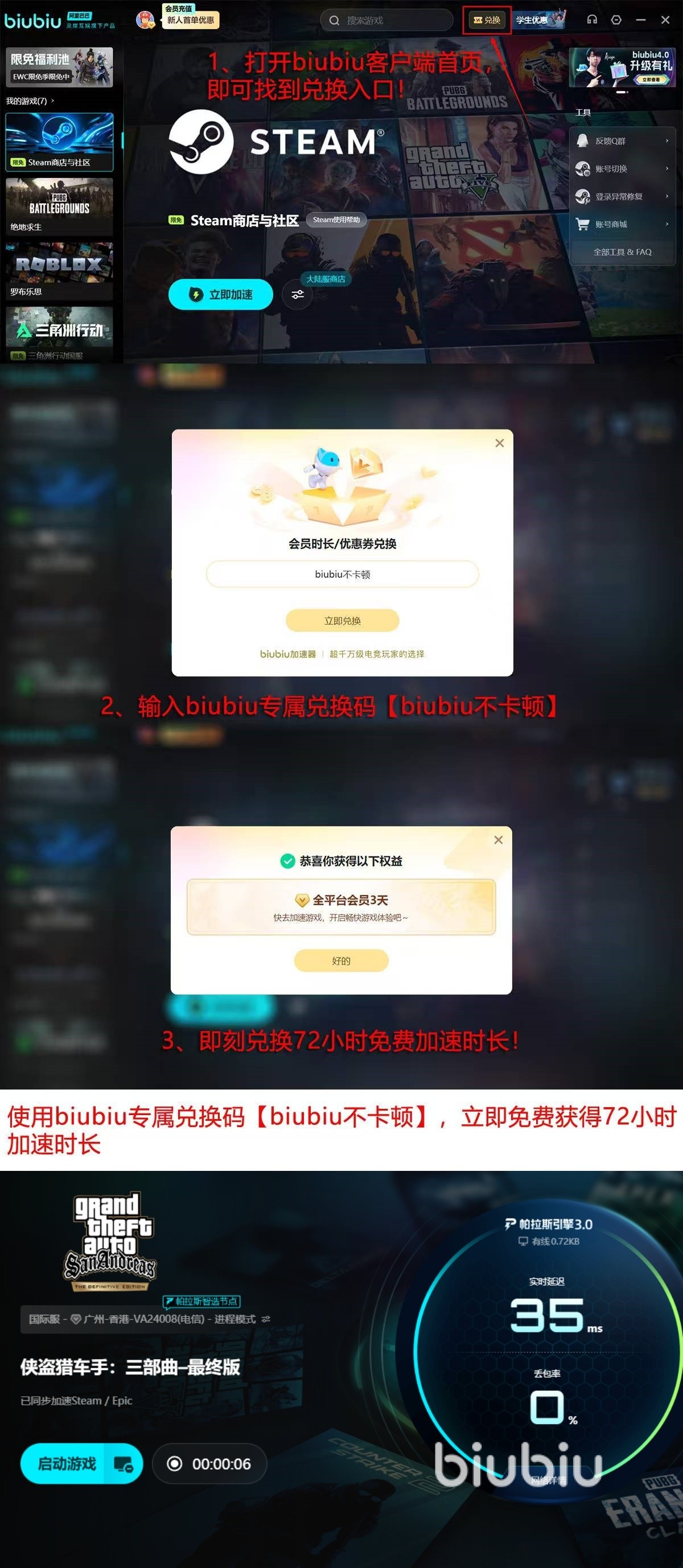 现在该程序对于新用户也有着不错的福利。新来的用户在注册完毕后可以获取到24小时的免费加速时间。如果在使用了兑换码【biubiu不卡顿】,那么还可以获取到额外的3天免费加速时间。