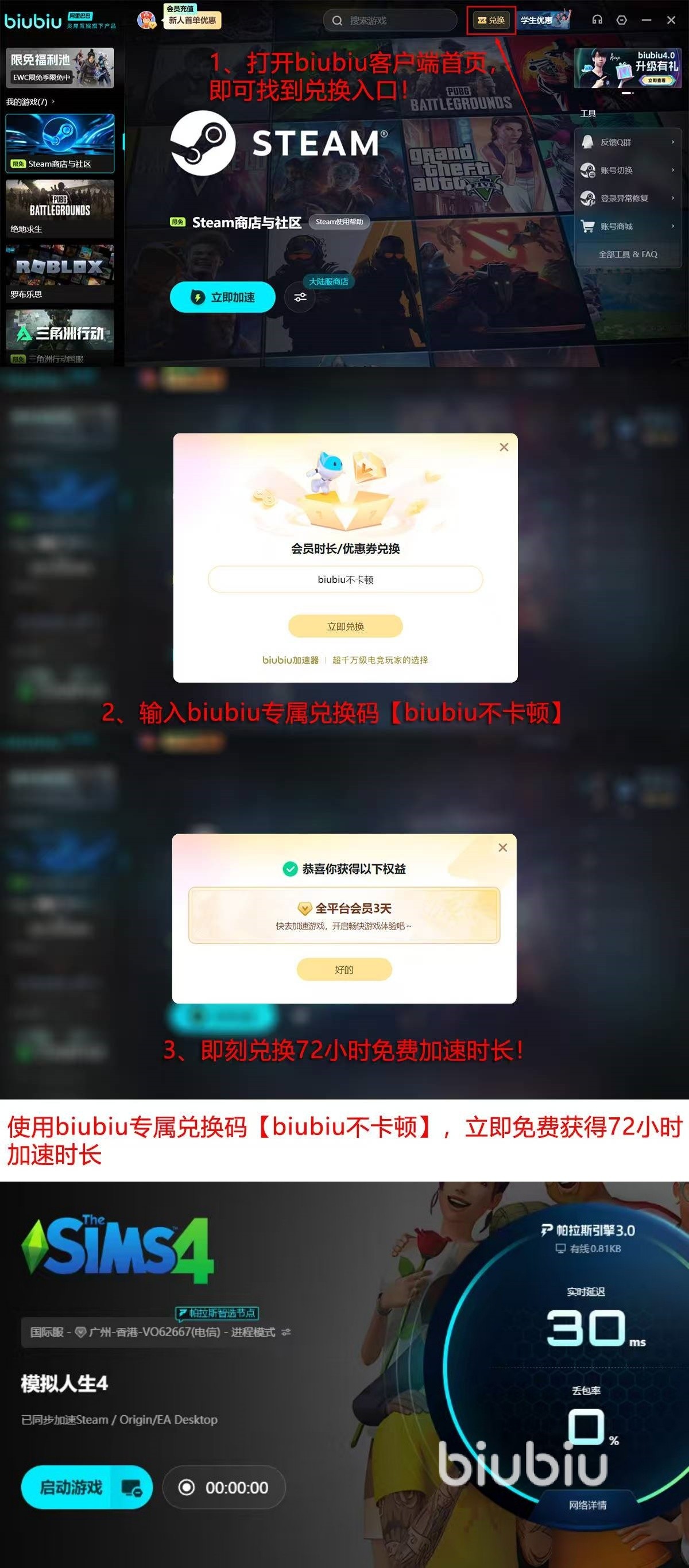 覆盖主流游戏的专属加速通道,支持一键识别并匹配最优节点,现在得到新用户的信任,还推出了免费体验计划,新人只要注册即可激活24小时的免费加速时长,另外在首页的兑换入口输入【biubiu不卡顿】,还可以获取72小时,这两个福利可以叠加总共新人能拿到96小时。