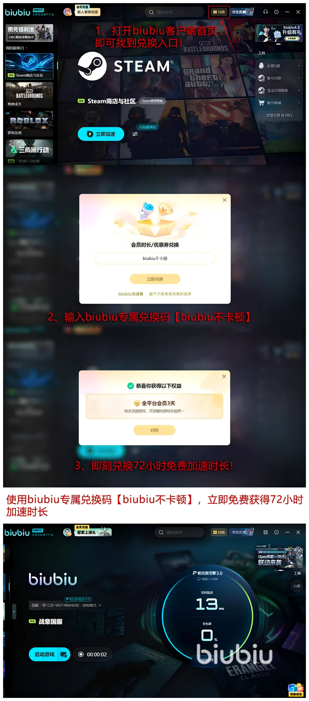 一定要知道【biubiu不卡顿】这个口令,该口令非常的有用,各位能够收获72小时的加速时间,并且各位叠加一下新人获取的加速福利24小时,也就是说总计能够获得96小时的加速时间,加速的效果非常的好,使用过后都感觉是非常的好用的。
