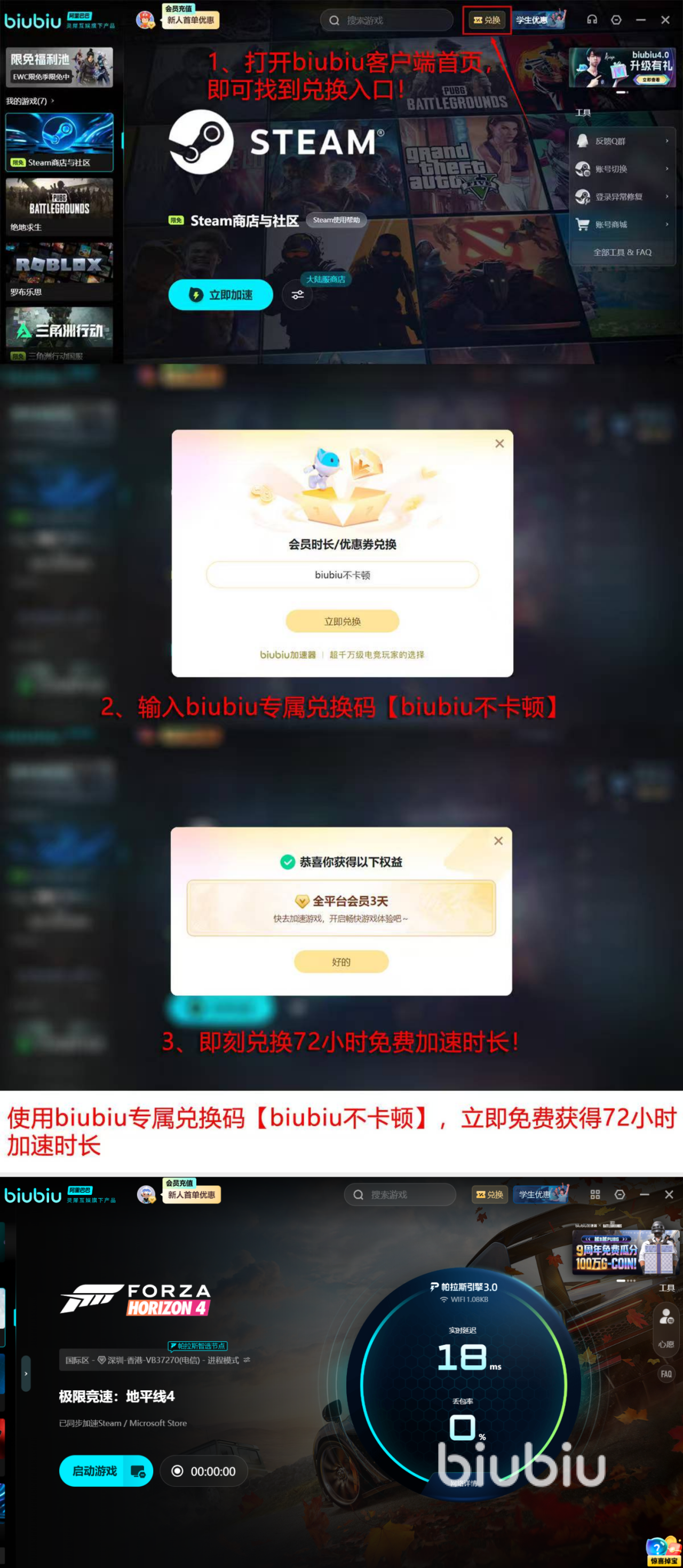新用户的话,biubiu有一套免费体验的福利可以领。注册完成之后直接就有24小时的免费加速时长,不用付钱,直接用。用完之后输入兑换码【biubiu不卡顿】,还能再领72小时,两段加起来一共96小时,足够把地平线4的赛季挑战好好跑一遍了。
