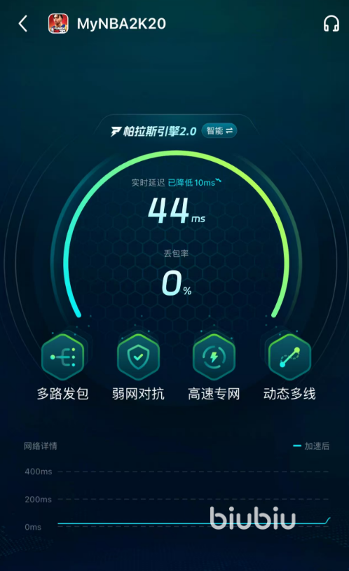 网络这道无形的屏障,专业的游戏加速工具才是破局的关键,biubiu加速器依靠自身的独特技术优势,成为稳定畅玩nba2k20的保证,不是简单的提供一个通道,它的内置的帕拉斯2.0智能引擎,就是针对手游加速痛点量身打造的。该引擎将多种自研黑科技融合在一起,可以自动检测、修正整个数据传输链路。从本地网络环境到游戏服务器节点,自动选择最优路径,大大降低延迟、减少丢包,从根本上解决由于网络波动造成的闪退问题。