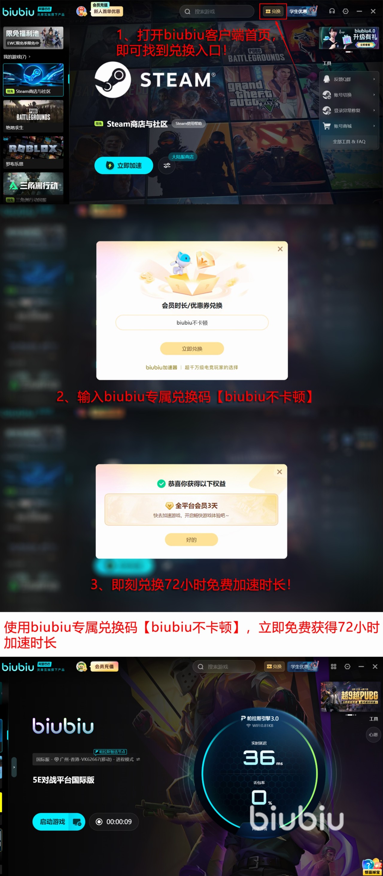 如果大家不确定biubiu的真实效果到底有没有那么强,可以参与到现在的新用户注册领24小时加速活动中来,通过这些免费时间去体验一下。觉得体验时间不够长,凡是注册用户还能在首页的兑换页里输入【biubiu不卡顿】口令来换3天时长,这样就能累计获得96小时加速时间了。