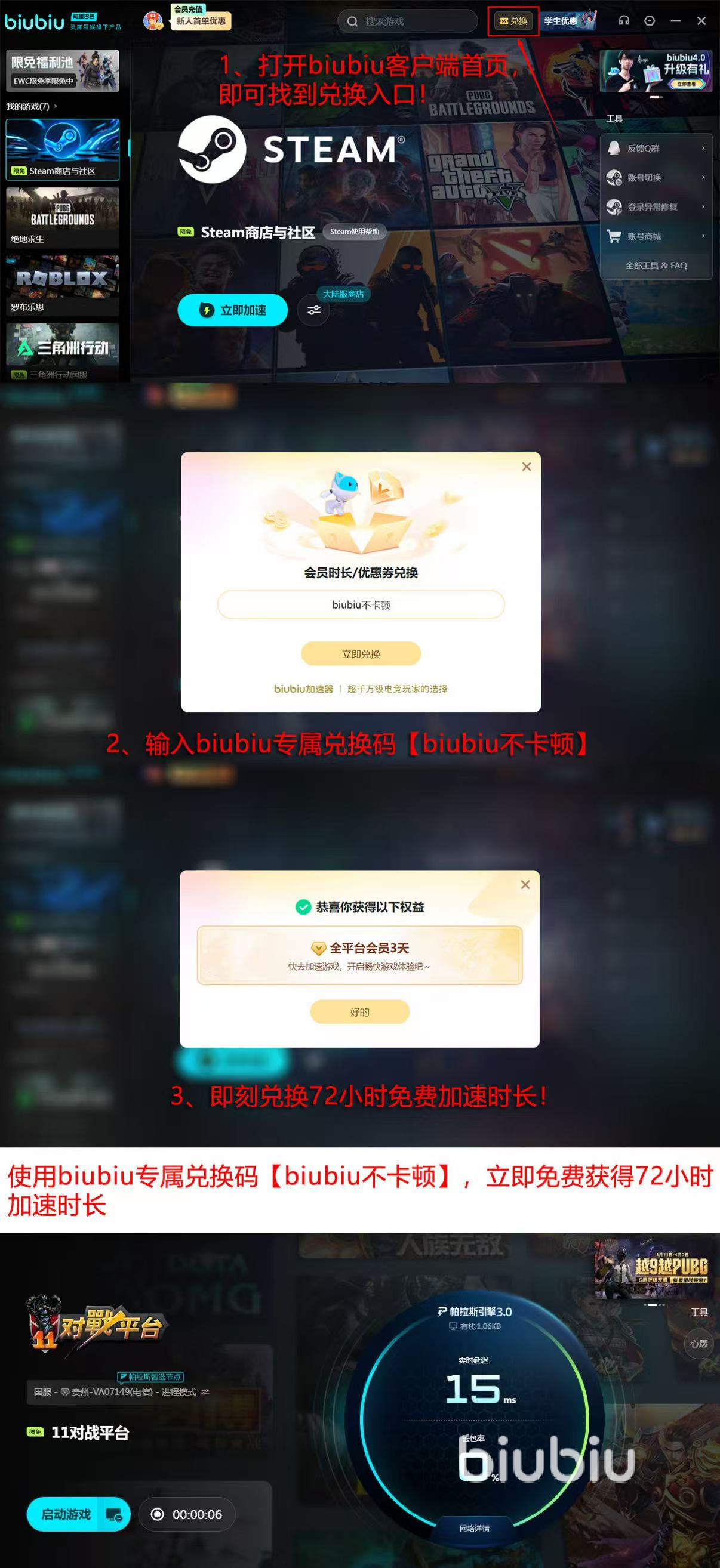 现在加入biubiu新用户还能享受到24小时全功能免费加速,首充优惠更是只要一杯奶茶的费用就能购买会员。今天还能额外领取到3天免费加速时长,所有用户输入兑换码【biubiu不卡顿】就能到账,零成本体验加速效果,试用软件再也不踩雷。