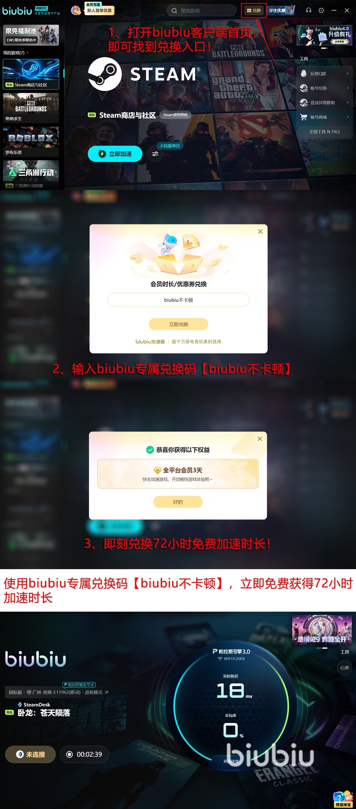 现在来体验,新人立刻激活24小时的免费试用时长。而输入兑换码【biubiu不卡顿】则能够兑换72小时的加速时长,此项兑换福利是新老用户均可领得一次。