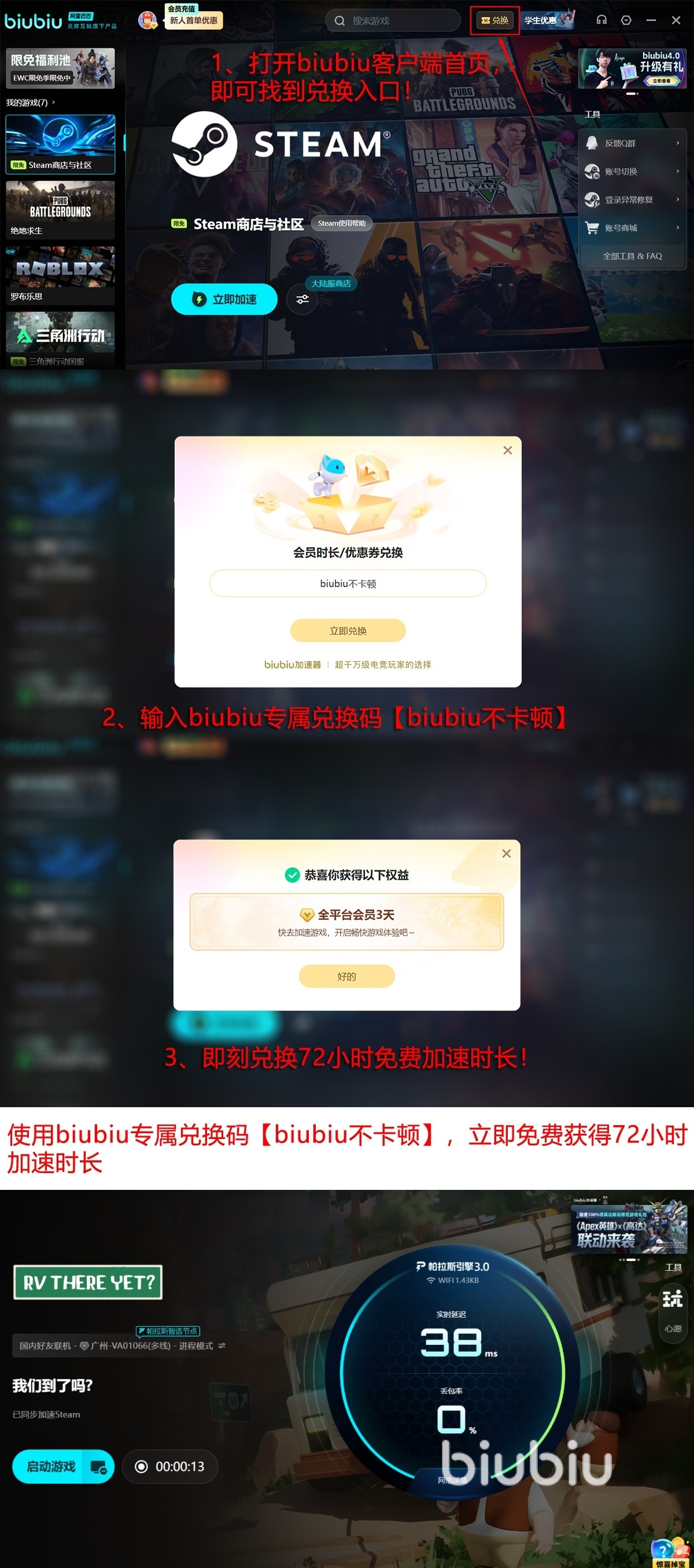 这里小编特别推荐大家来领些免费福利,无成本的试用。新人来注册就能激活24小时的免费试用;接着在首页的兑换功能上,输入小编分享的专属码:【biubiu不卡顿】,各位新老用户可以领取三天的使用时间。也就是新人叠加起来用,福利时间可长达96小时呢。