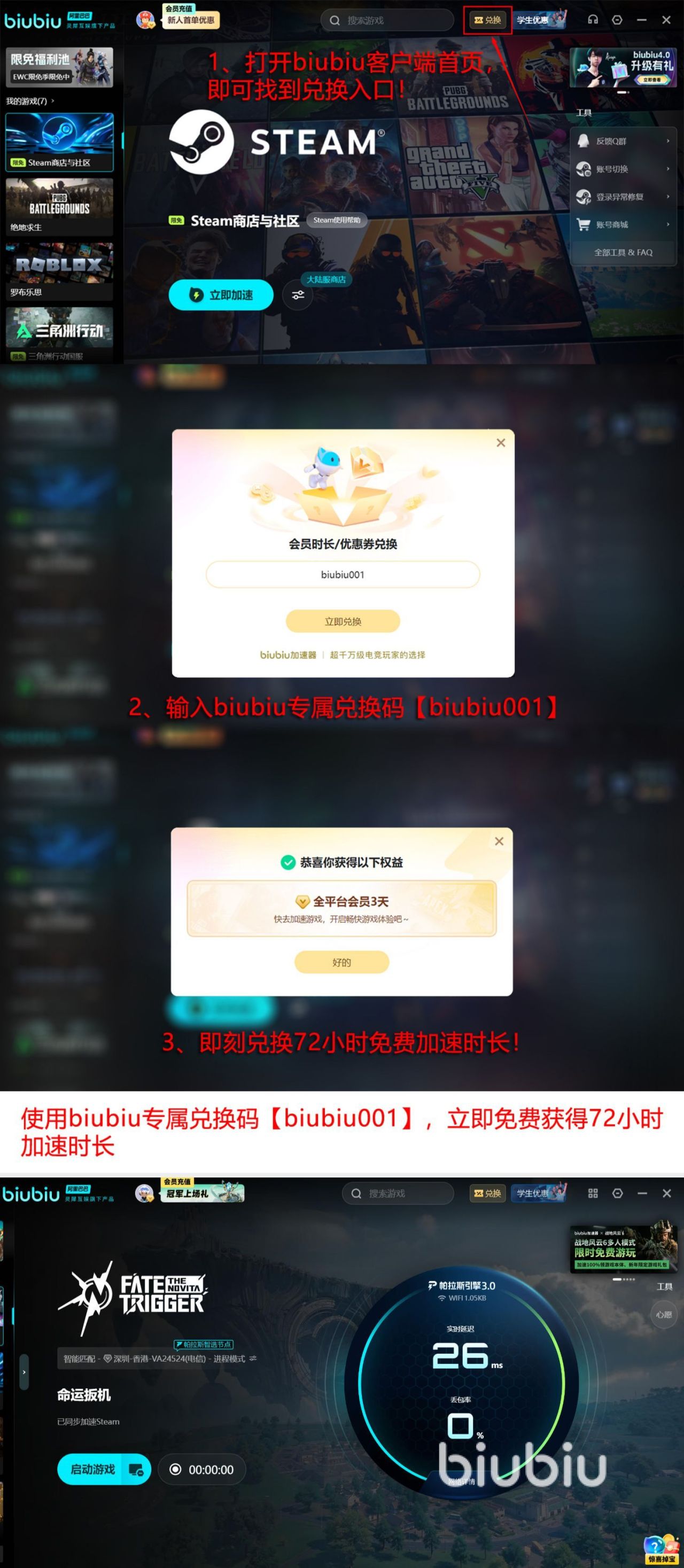 如果大家深入了解:biubiu加速器的福利也是比较丰富的,比如新老用户都可以直接使用兑换码【biubiu001】,这样就能够领取三天免费加速时长。新用户刚开始注册biubiu加速器,可以再获得24小时的免费加速时长,当新用户将这两个福利搭配在一起使用,累计就可以获得96小时的免费加速时长。在这样的情况下,能够让大家零成本的享受流畅的体验。