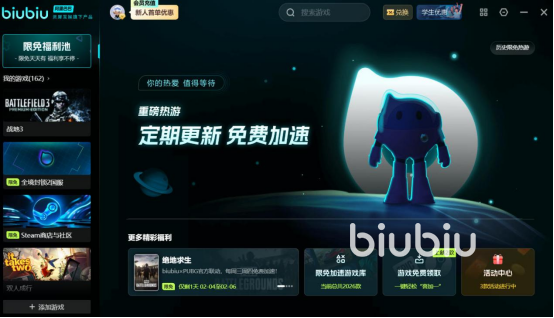 考虑到很多的玩家在玩游戏的时候,都有可能会由于网络拥堵以及网络状态不佳的原因,使大家的游戏受到严重的影响,所以今天给大家着重的这一款工具,还给大家带来了非常大的福利,新用户注册登录,就能够免费加速24小时。另一种还可以通过输入【biubiu001】的方式,免费获得三天加速时长。新用户两种方法可以叠加在一起使用,可以免费加速96个小时。