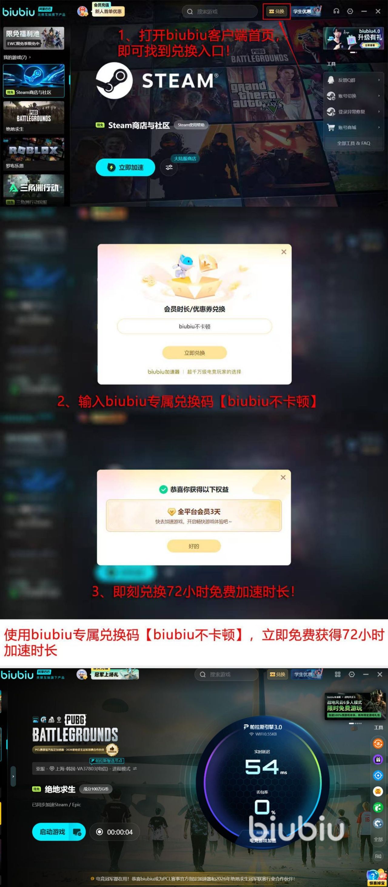 现在biubiu有一个试用活动,新用户注册完成之后可以直接领24小时的免费加速时长,不用付费就能体验完整功能。用完之后,新老用户都可以输入兑换码【biubiu不卡顿】,再领72小时的免费时长。两个加起来是96小时,拿来打PUBG完全够用了。