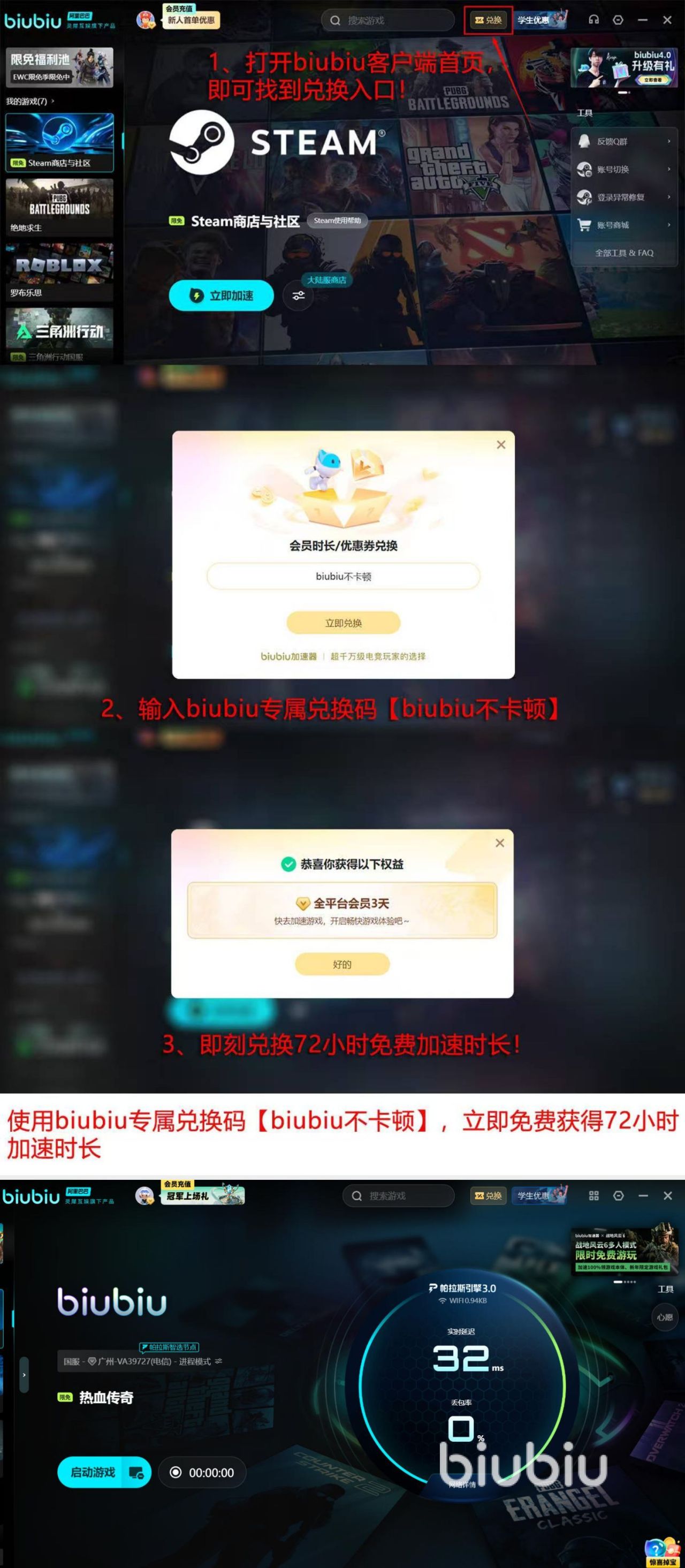 福利方面也挺实在的。新用户注册完成之后,直接就有24小时的免费加速时长可以用,不用花钱先体验一下。用完之后,输入兑换码【biubiu不卡顿】,不管是新用户还是老用户都能再领72小时,两段加起来一共96小时,够玩好几天了。