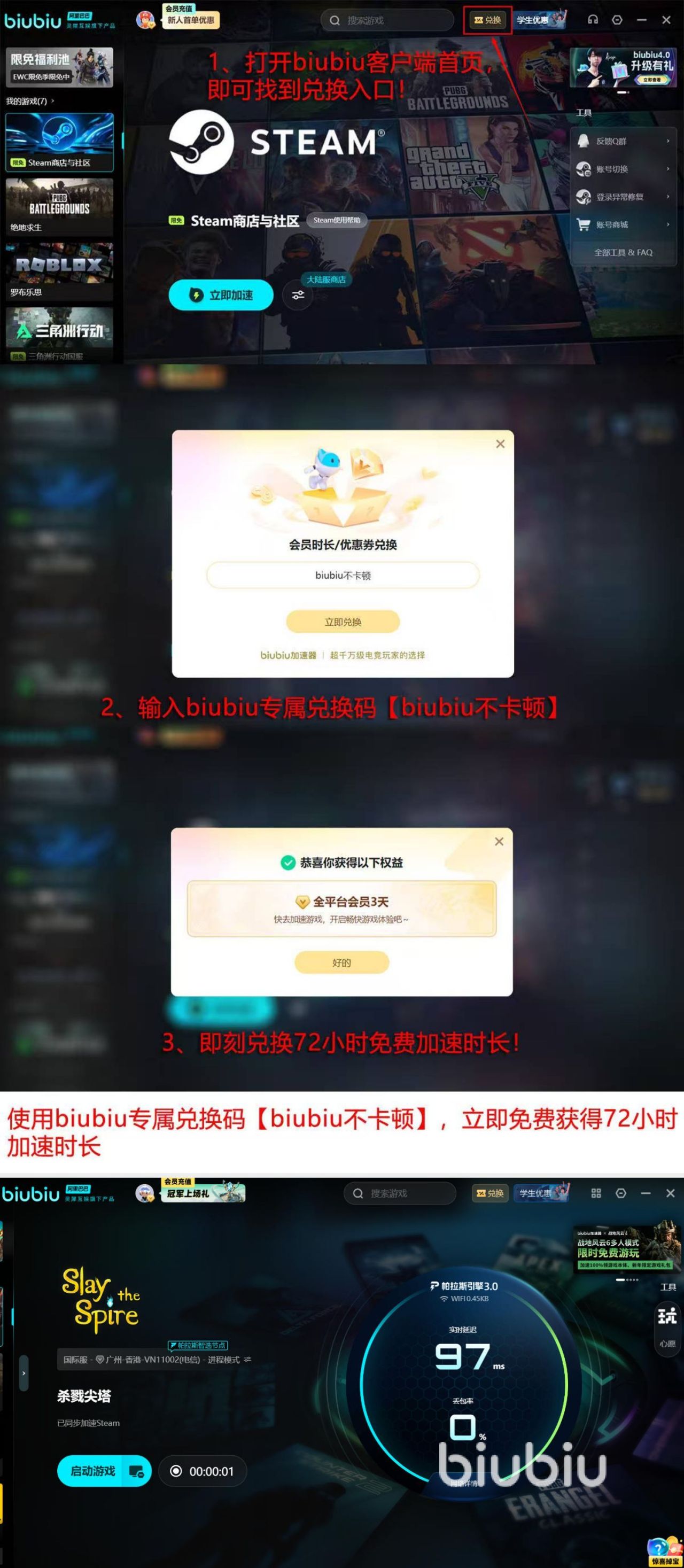 福利这块也值得说一下。新用户注册完成之后,当天登录就能直接拿到24小时的免费加速时长,不用付费,直接用。用完之后再输入兑换码【biubiu001】,还能再领72小时,两段时长叠加起来一共是96小时,差不多能免费用四天。对于想先试试效果再决定要不要充值的玩家来说,这个门槛已经很低了。