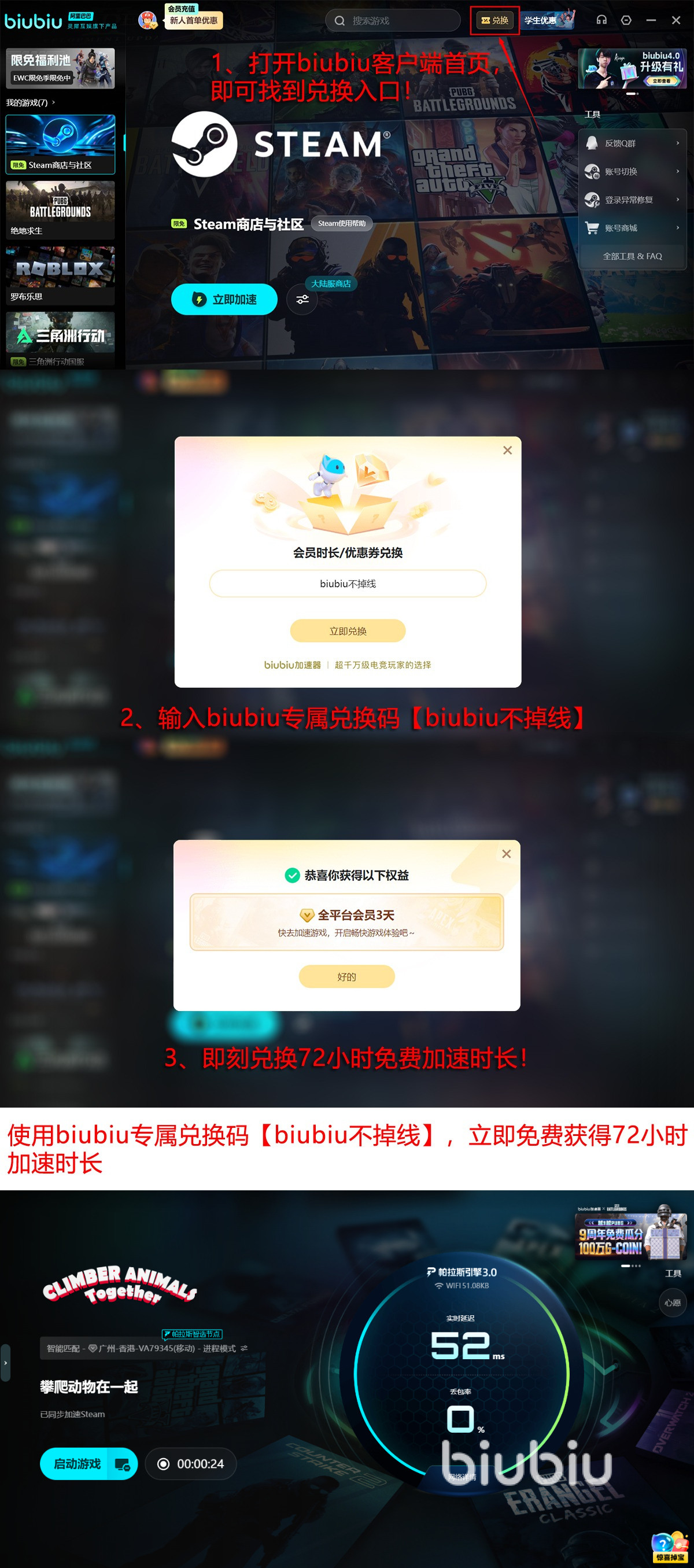 新用户注册biubiu加速器后,可立即领取24小时全功能免费加速权益。使用专属口令【biubiu不掉线】,还可额外获得72小时加速时长,总计享96小时零门槛试用服务。该服务全面覆盖《攀爬动物》Steam国区服务器连接、匹配响应及实时同步需求,助力玩家稳定发挥操作上限。