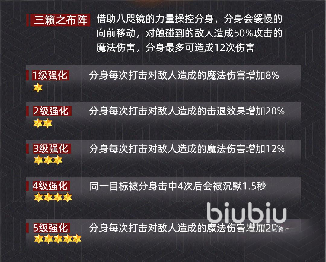 她的主动技能“三籁之布阵”具备双重战术意义:召唤风神分身对路径上敌人造成总计12次、每次50%魔法伤害;技能强化后额外附带击退效果,可打断敌方关键技能释放节奏。该技能兼具持续伤害与强控能力,是团队衔接与集火前摇的核心保障。