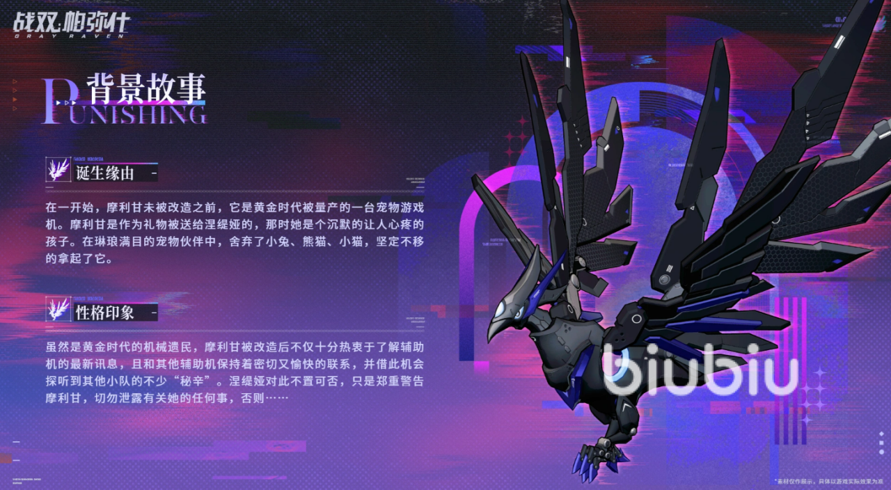摩利甘的起源颇具故事感:它最初是黄金时代标准化产线制造的宠物游戏终端,属于无编号量产型号,本不具备独立意识或特殊机能。后作为礼物赠予年幼时期的涅缇娅。彼时的涅缇娅性格内敛、言语极少,面对陈列的多款拟态伙伴——包括小兔、熊猫与小猫等常见形象,她却毫不犹豫选择了外观沉静、轮廓锐利的摩利甘。这一选择成为二者长期共生关系的起点,也为后续深度绑定的机制设计埋下伏笔。