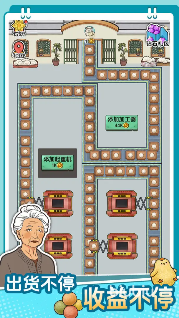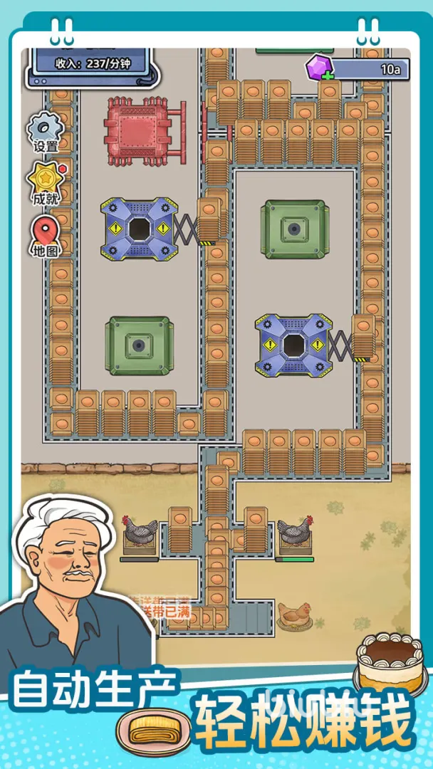 游戏机制聚焦于空间布局与效率优化:玩家需在有限地图内合理配置加工工厂、升级产线设备、调整传送路径,将原始农产品转化为高附加值商品。所有环节支持自动运转,金币收益实时累积,达成目标后即可解锁下一阶段工厂——例如由蛋类初加工厂进阶至乳制品精炼厂,再拓展至肉制品深加工中心,形成清晰的五级产业跃迁体系。
