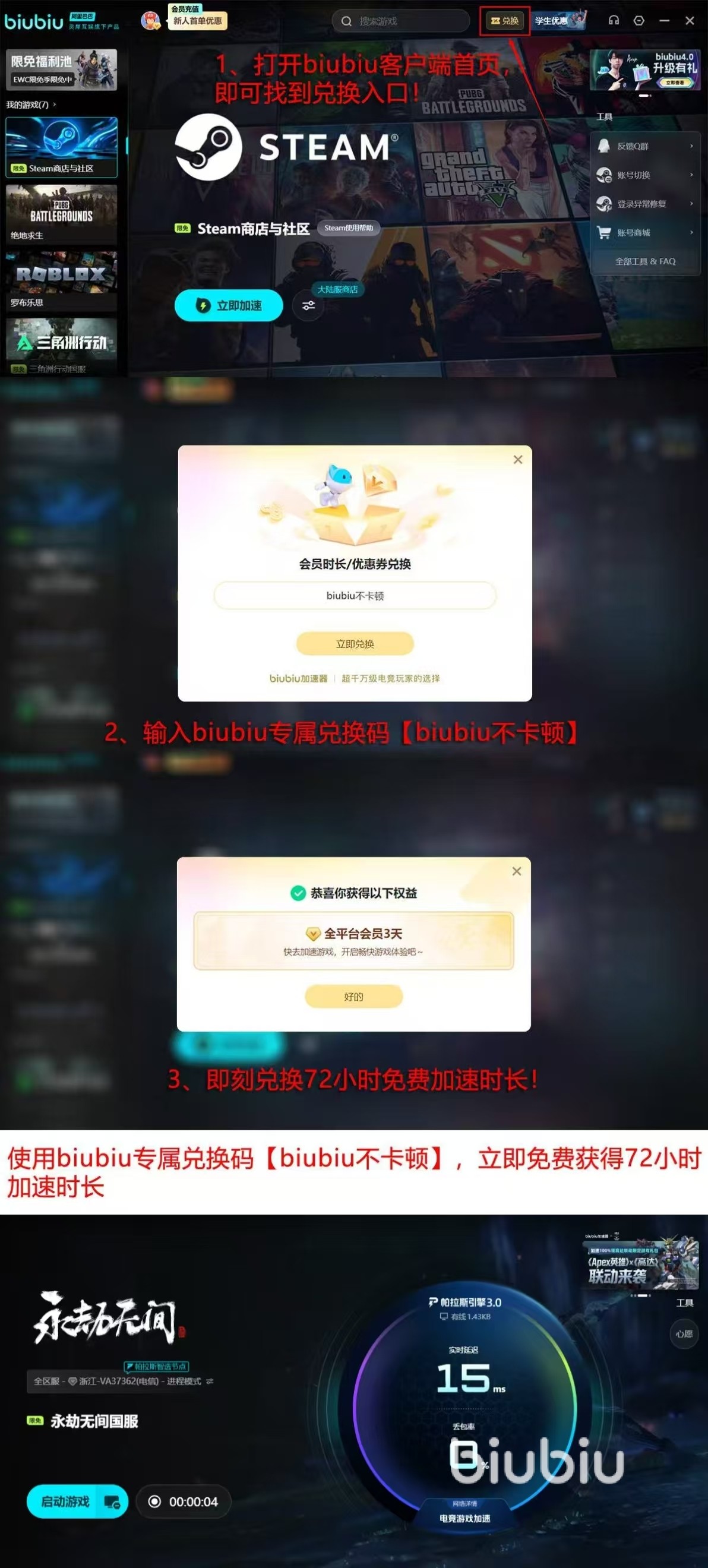 针对新用户,biubiu加速器提供零门槛体验机制:完成账号注册即可获赠24小时全功能试用权限;若在激活界面输入专属兑换码【biubiu不卡顿】,还可叠加72小时加速时长,总计可享不少于96小时的完整服务周期。该设计兼顾测试充分性与使用灵活性,便于玩家在不同网络环境(如家庭Wi-Fi、校园网、4G/5G移动热点)下完成多场景验证,精准匹配最优加速策略。
