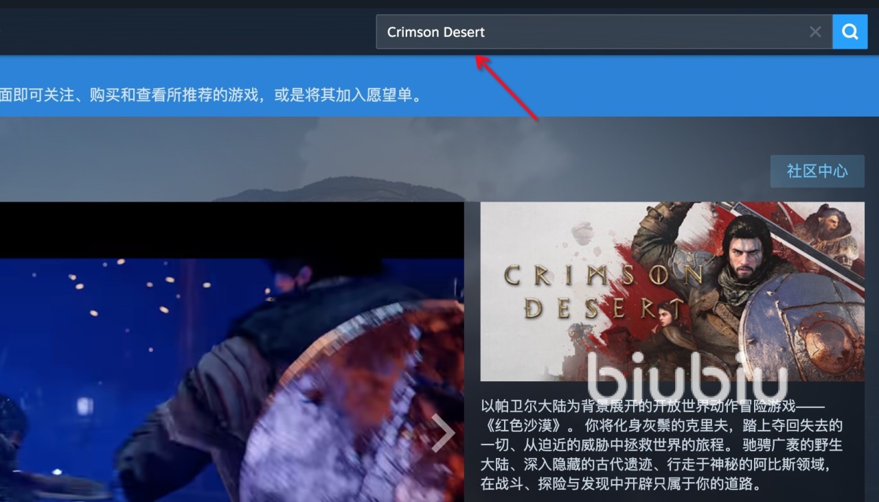 2026年03月20日 21:34 来源:小速《红色沙漠》是一款由韩国开发商Pearl Abyss打造的开放世界动作角色扮演游戏,Steam平台国区已正式上线中文名称“红色沙漠”,玩家无需记忆英文原名Crimson Desert,直接在Steam搜索框输入“红色沙漠”即可准确找到游戏页面。目前游戏已开启预购,建议提前加入愿望单,以便发售第一时间获取推送提醒。