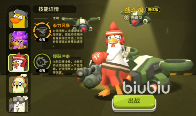 战斗鸡为初始免费赠送角色,无需抽卡、解锁或付费获取。其定位为近战突袭核心,擅长切入敌方阵型前排。基础技能为“冲拳突进”:角色向前高速位移并进入拳击姿态,命中目标后触发一次范围爆炸伤害,对主目标造成基础伤害的同时,对半径1.5米内的其他敌人附加溅射伤害。该技能兼具位移、控制与输出三重功能,是开团与反打的关键手段。