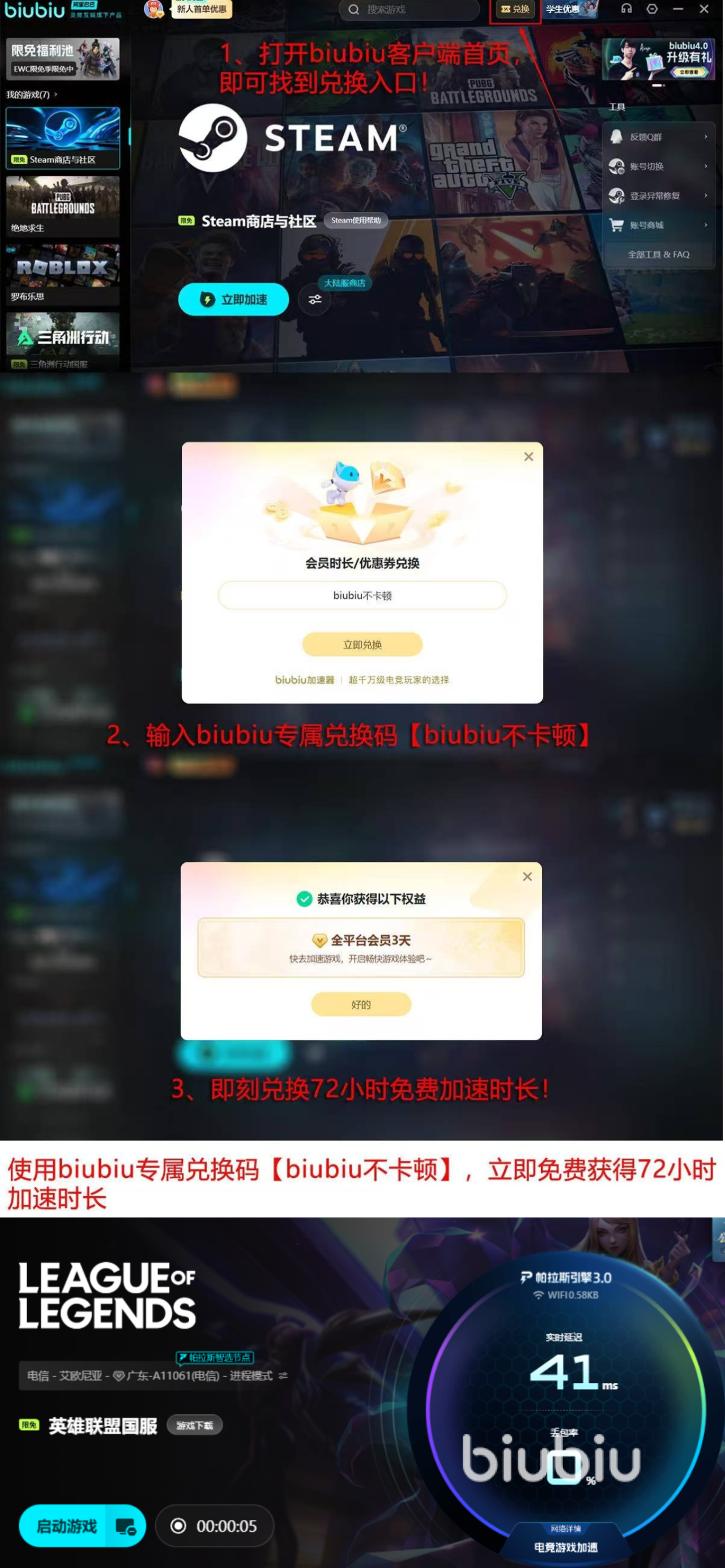 面向新用户,biubiu加速器提供分阶段体验机制:注册账号即可激活24小时全功能试用权限;成功输入兑换码【biubiu不卡顿】后,额外获得72小时高级加速服务。累计96小时无限制使用周期,覆盖完整排位赛周期与版本更新适配期,便于玩家深度评估稳定性、延迟表现及兼容性表现。