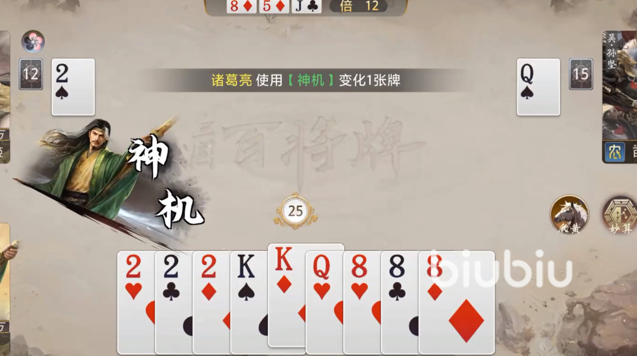 赵云作为T0级泛用型武将,技能机制强调操作弹性——可通过弃置对子或单牌换取万能牌使用权,单局最多弃置7张手牌;诸葛亮则提供高阶策略支持,“妙算”可在叫分阶段预览底牌,大幅提升决策精度;另一技能“神机”允许将点数大于K的单张牌,转化为当前手牌中数量最多的牌型(如对子、顺子等),该效果需结合手牌结构谨慎发动,对新手操作时机把控要求较高。