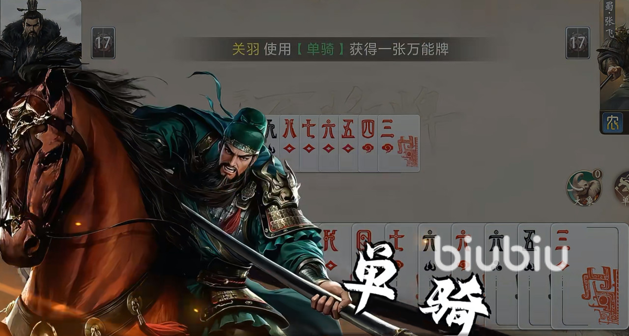 游戏中武将按势力划分为魏、蜀、吴及群雄四大阵营,其中魏、蜀、吴为当前主力输出体系。蜀国整体节奏紧凑、进攻主动性强,代表武将关羽拥有双形态技能体系:“武圣”可在对手打出顺子时,随机抽取其一张手牌,实现资源压制与信息干扰;“单骑”形态下,完成顺子出牌后可获得一张万能牌,若配合赤兔马,则可触发四联顺特殊效果,显著提升连招稳定性与压制强度。