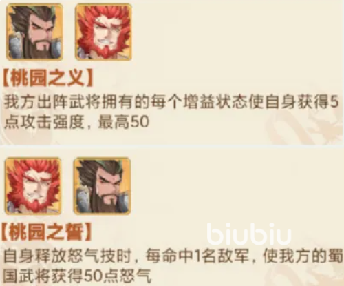 关羽与张飞二人组合可独立触发双层联动羁绊——“桃园之义”与“桃园之誓”。前者依据我方全体增益状态总数,为两人各自提供最高50点攻击强度加成(每1层增益+5点);后者则在任意我方武将成功释放怒气技能并命中敌人后,为所有蜀国出战武将统一增加50点怒气值,且无角色数量限制。两项效果可叠加生效,既提升单位输出效率,又加速全队技能轮转节奏,使蜀国阵容在中后期爆发阶段形成持续高压输出链。