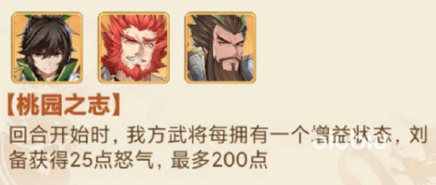 以“桃园之志”为核心羁绊,需同时上阵刘备、关羽、张飞三人方可激活。该羁绊于每回合开始时自动生效,为全体我方武将提供基础增益状态。特别机制在于:每存在1个增益状态,刘备即可额外获得25点怒气值,最高可叠加至200点。这一设定使刘备不仅承担前排承伤与治疗职能,更成为全队怒气循环的核心枢纽,大幅提升技能释放频率与队伍持续作战能力,是蜀国阵容中不可替代的战术支点。