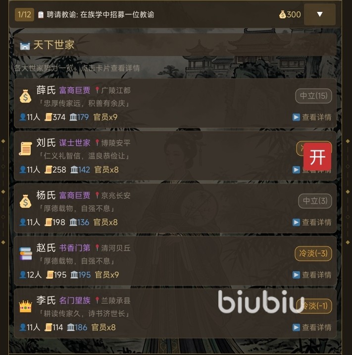 家族外部关系网络是影响长期存续的关键变量。玩家需主动开展外交互动:与地方望族建立贸易或学术同盟,借势发展;通过联姻缔结稳固政治纽带;亦可逐步渗透朝堂,与皇帝、太子、重臣等核心势力构建信任关系,获取政策倾斜、赦免特权或军事庇护,显著降低发展过程中的系统性风险。