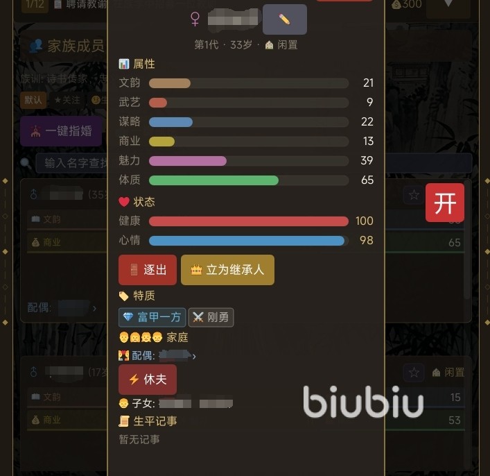 家族成员成长体系结构清晰、逻辑严谨。每位族人可通过书院提升学识、武场锤炼武艺、工坊研习技艺等多类建筑进行定向培养;同时,升级家族建筑可同步强化其对成员的能力加成效率,形成“基建—人才—发展”的正向循环。玩家还可随时查阅成员详尽档案,包括天赋倾向、能力倾向与性格特征,据此为其规划仕途、军职、商路或隐逸等差异化人生路径,使个体价值与家族战略高度协同。