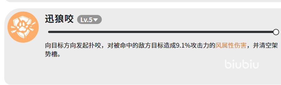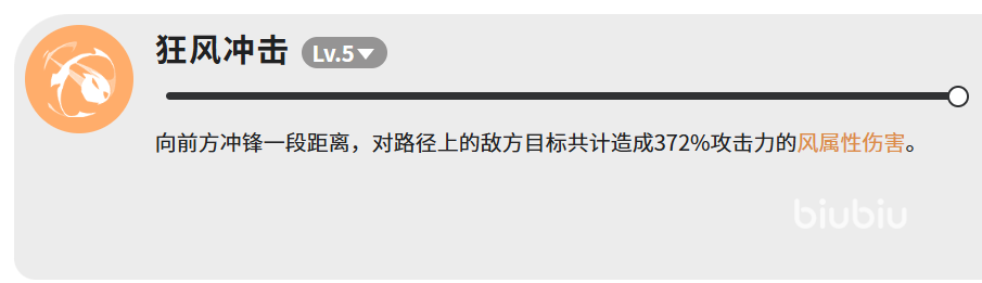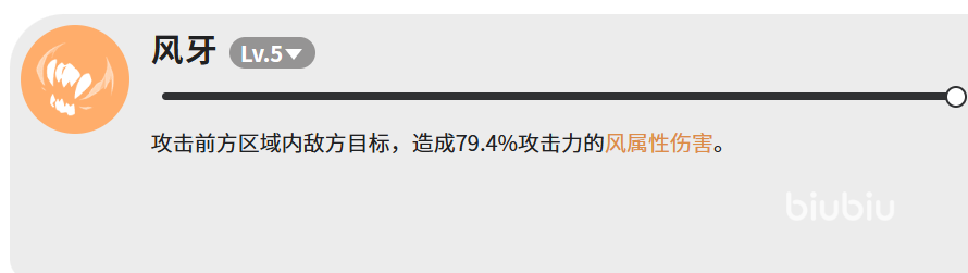 【风牙】属于基础范围攻击技能,对正前方扇形区域内的目标造成一次风属性伤害,数值为攻击力的79.4%。技能范围适中、冷却较短、释放稳定,常用于衔接空档、补足伤害或配合控制后追击。