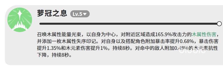 技能「萝冠之息」(满级LV.5)为核心辅助型技能:以自身为中心释放木属性能量光束,造成165.9%攻击力的范围伤害,并施加1层木属性失序印记;同时为自身及编队内所有角色提供持续8秒的增益效果——暴击率+0.68%、暴击伤害+1.35%、木元素伤害+1%;被命中的敌人则降低0.48%木元素抗性,持续时间同步为8秒。该技能虽非高伤主力,但其减抗与团队增益双重作用,显著提升木系队伍整体输出效率。
