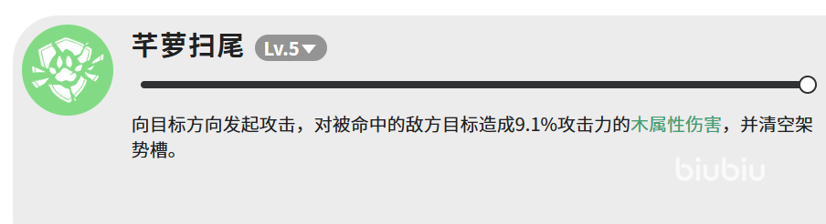 技能「芊萝扫尾」(满级LV.5)为战术衔接技:向目标方向发动突进打击,造成9.1%攻击力的木属性伤害,并强制清空命中目标的架势槽。尽管基础伤害偏低,但架势清空效果可使敌人进入易伤状态,大幅提高后续高倍率技能的收益。该技能常用于连招起手或节奏转换节点,是构建高效输出循环的重要枢纽。