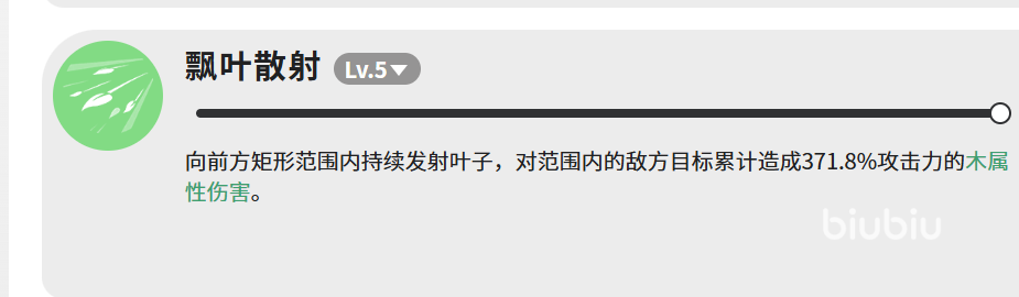 技能「飘叶散射」(满级LV.5)为高频范围输出技:向前方矩形区域连续发射木属性叶刃,总计造成371.8%攻击力的伤害。作为三段主要输出技能中总伤数值最高者,该技能适用于压制多目标场景,尤其适合应对正面密集分布的敌群。需注意其攻击判定呈纵向矩形,横向覆盖有限,实战中建议保持正对目标方向以确保命中率。