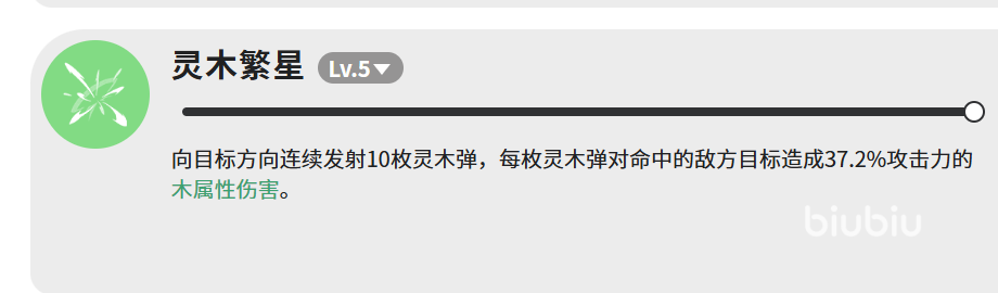 技能「灵木繁星」(满级LV.5)专注单体爆发:向指定方向连续发射10枚灵木弹,每枚造成37.2%攻击力的木属性伤害,全额命中时总伤达372%,与飘叶散射相当。区别在于其弹道集中、目标明确,更适配高威胁单体Boss或处于硬直/禁锢状态的敌人。若目标位移频繁,建议配合控制技能使用以保障命中稳定性。