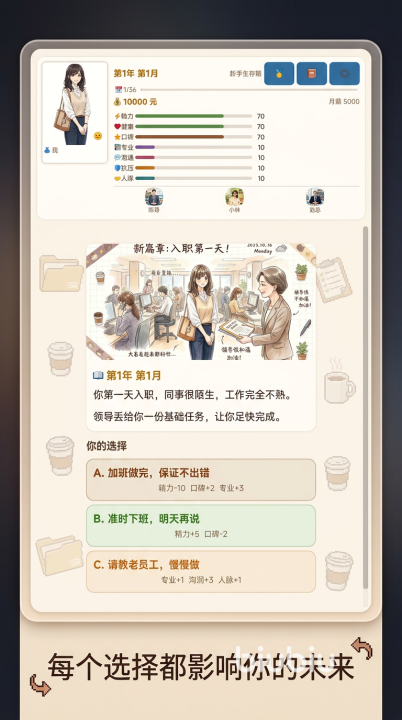 游戏采用写实向数值驱动机制,核心属性包括精力、专业、口碑、够润四大维度。每日任务触发后,玩家需在多重选项中做出权衡——例如接受加班任务将同步降低精力值,但可提升专业与口碑;若长期忽视人际维护,口碑持续下滑,则可能触发解雇事件。每个决策链均影响后续职业轨迹,形成强反馈闭环。