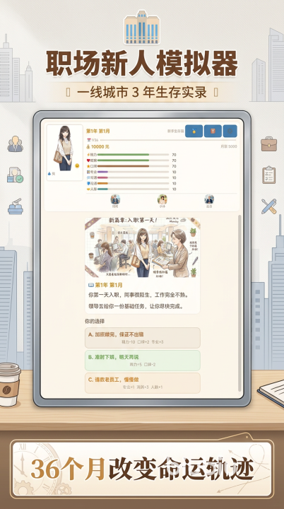2026年03月21日 14:25 来源:小速想要提前感受真实职场环境,探索多元职业路径,甚至预演不同人生阶段的发展可能?《职场新人模拟器》正是一款以文字叙事与实景图鉴相结合的沉浸式模拟游戏。它不依赖复杂操作,而是通过细腻的剧情分支、动态属性系统与阶段性成长反馈,让玩家从“第一天入职”开始,深度体验从应届生到职业经理人的完整36个月进阶历程。