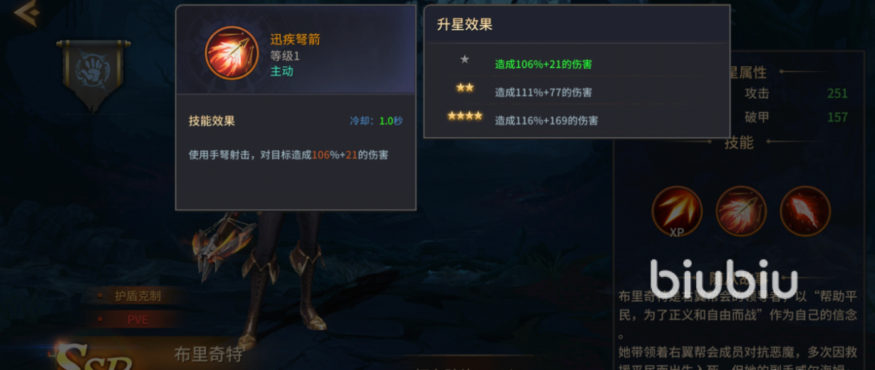 布里奇特的核心职能定位为“护盾压制者”,这使其在角色功能谱系中独树一帜。她的主动普攻“迅捷弩箭”虽为单体基础伤害技能,但并非单纯输出手段——该技能每命中一次均可触发能量回复与被动叠加效果,是维持技能循环、保障持续作战节奏的底层支撑。随着星级提升,该技能的基础伤害加成同步提高,确保她在任意战斗阶段都能提供稳定而可靠的火力覆盖。