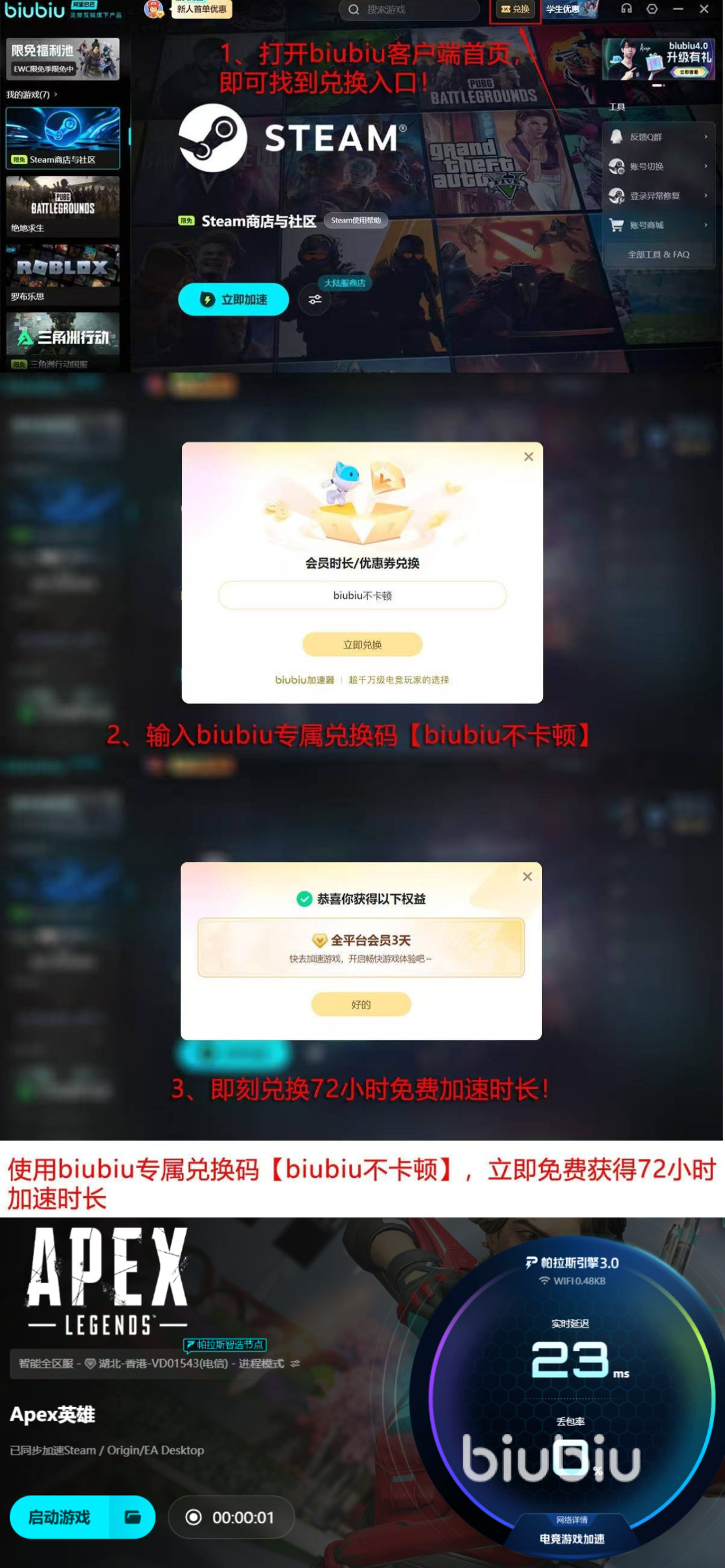 新注册用户可直接获得首日24小时全功能免费试用权限,无需任何付费操作;额外输入激活码【biubiu不卡顿】,还可叠加领取72小时延长试用期,累计享96小时无限制加速服务。玩家可在实际运行Apex英雄的过程中,直观验证其对闪退问题的干预效果及整体网络质量的提升幅度。