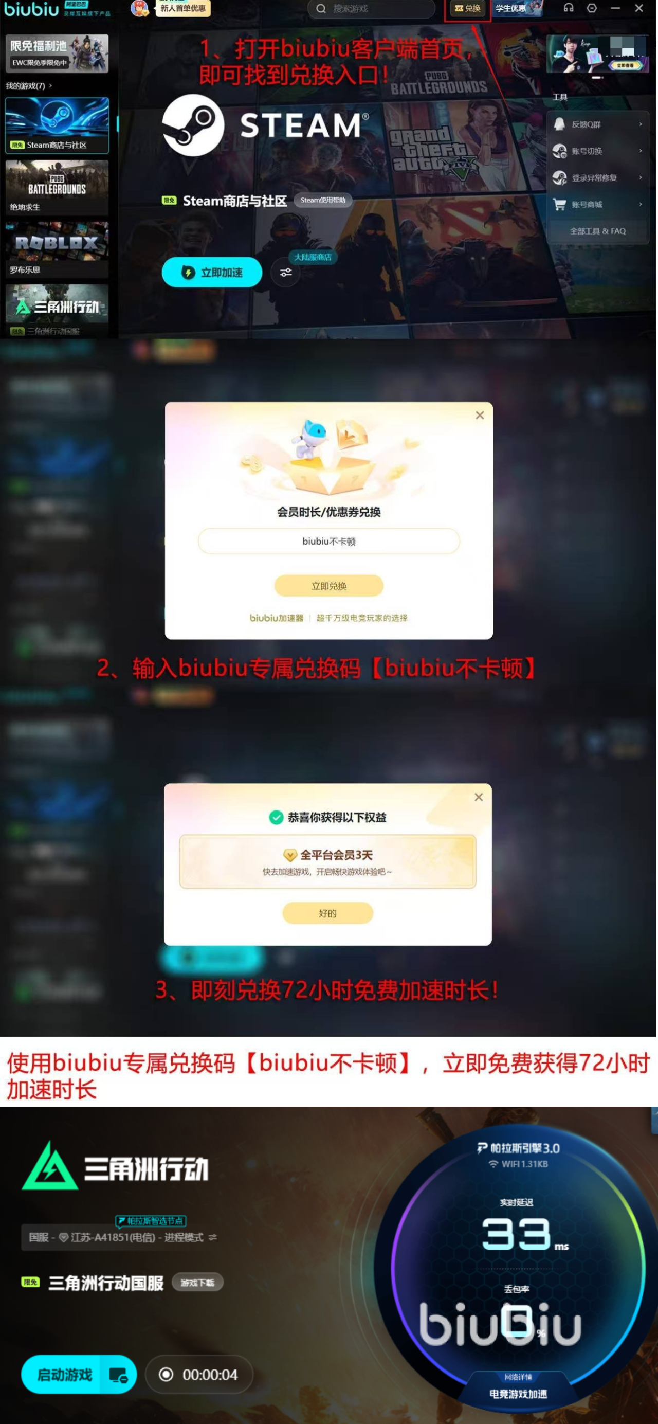 对于尚未决定是否启用加速服务的用户,biubiu加速器提供无门槛体验机制:完成账号注册即可获赠24小时全功能免费试用权限;输入专属兑换码【biubiu不卡顿】,还可额外领取72小时加速时长,覆盖完整新手适应期与多局实战验证周期。