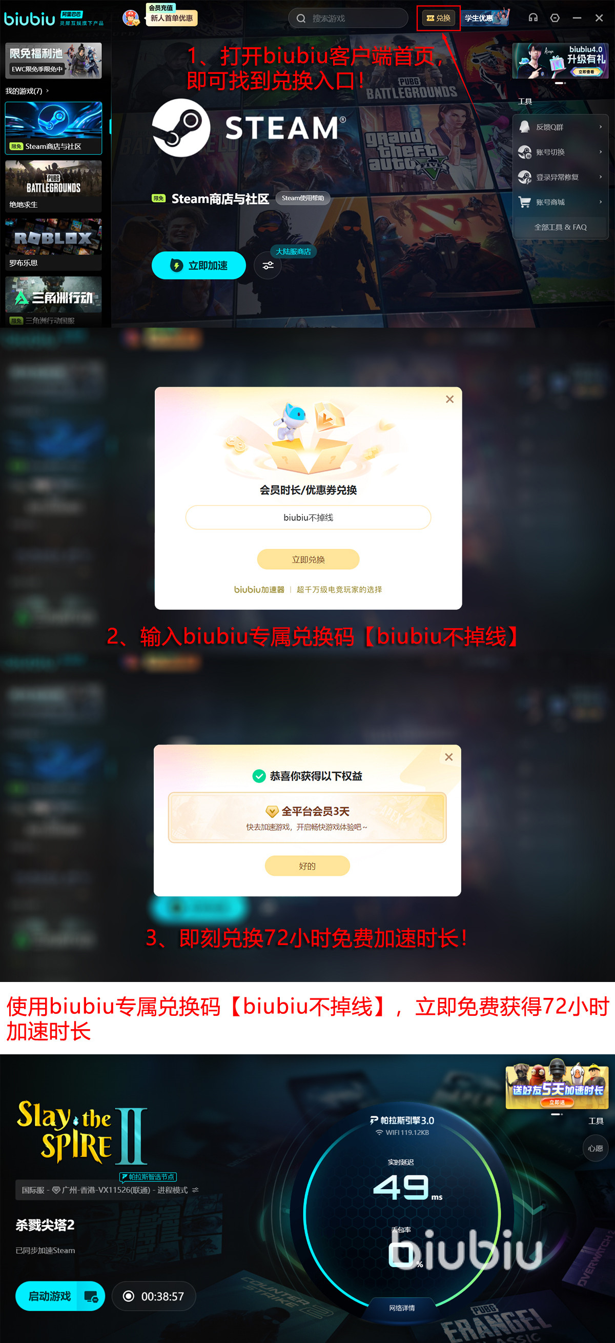 了解上述四大猎人流派后,建议结合自身操作习惯与理解深度进行针对性练习。为保障《杀戮尖塔2》联机体验流畅稳定,推荐使用综合性能最优的biubiu加速器。该工具搭载帕拉斯3.0加速引擎,由阿里巴巴灵犀互娱提供底层技术支持,覆盖九游、交易猫、biubiu加速器三大产品线。加速服务兼具低延迟与高稳定性,新用户注册即可领取96小时免费时长——含登录即得的24小时与兑换码【biubiu不掉线】激活的72小时,后续福利持续加码。