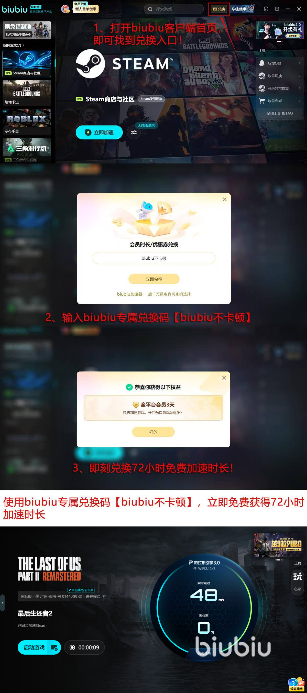 新用户注册即可领取24小时全功能免费试用权限;输入激活码【biubiu不卡顿】还可额外获得72小时加速时长。两项权益叠加,总计可享96小时高品质网络加速服务。