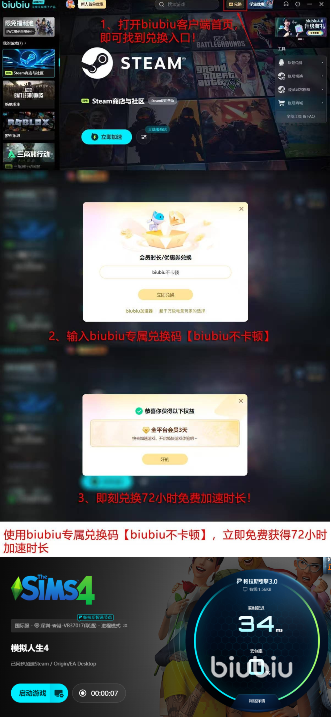 新注册用户可获得24小时免费试用权限,输入激活码【biubiu不卡顿】还可额外领取72小时加速服务,总计享96小时全功能体验。在此期间,用户可全面评估不同节点的实际加速效果,对比延迟变化与画面流畅度差异,并自主筛选适配自身宽带环境的最佳连接方案。无论新手入门还是资深玩家,均可借助该服务规避技术性障碍,专注享受《模拟人生4》带来的沉浸式生活模拟乐趣。