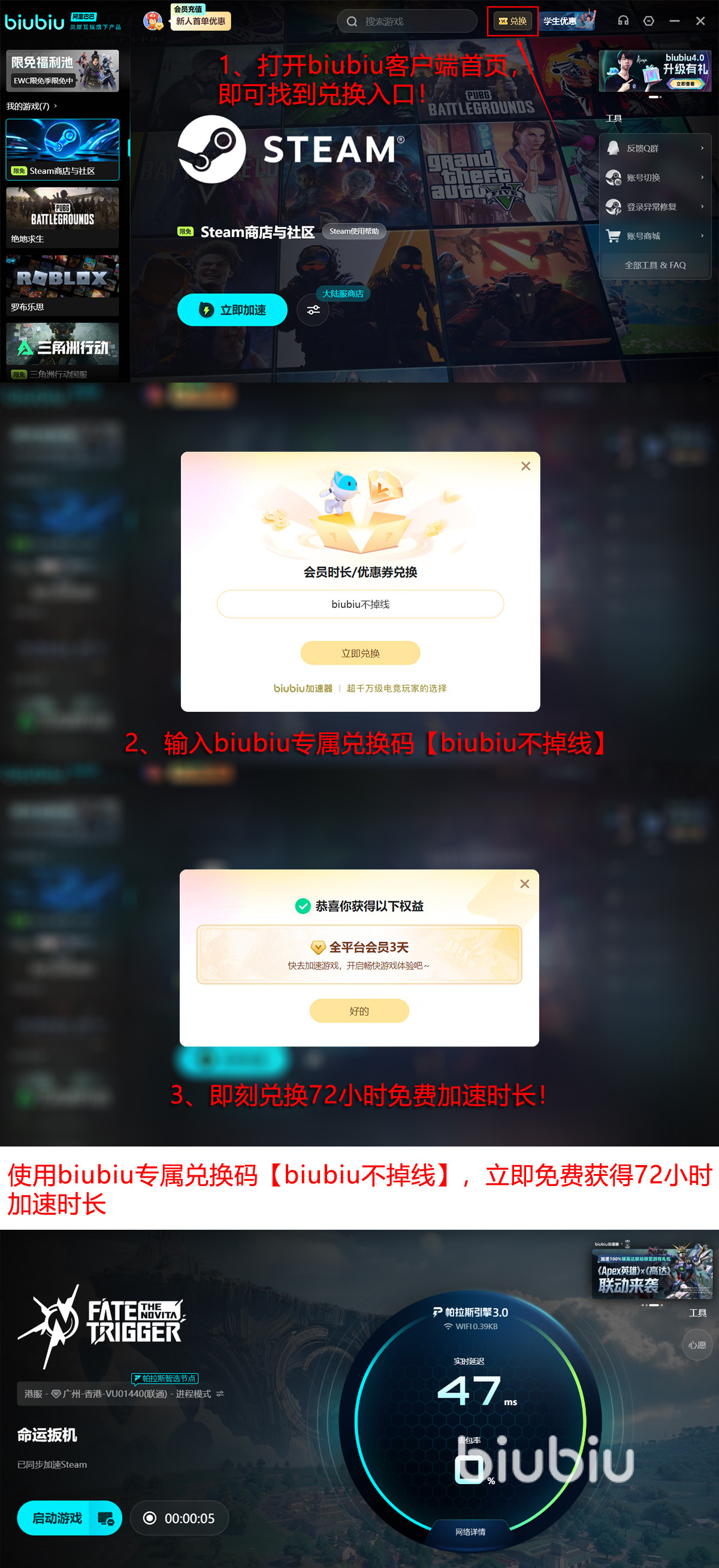 新用户完成下载注册即可获得24小时免费加速时长;额外填写兑换码【biubiu不掉线】还可额外领取3天高级会员权益,累计享96小时稳定低延迟服务。建议玩家提前部署,确保首发首周获得顺畅体验。