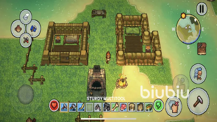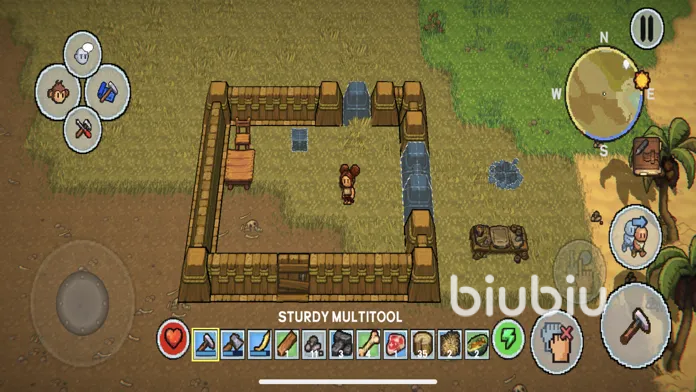 游戏内置动态昼夜循环机制,岛屿风貌随时间推移实时变化:晨雾弥漫的林间小径、正午炽烈阳光下的珊瑚礁滩、暮色渐染的火山岩坡、以及暗夜中悄然出没的异种生物……每一次探索都带来全新视觉体验与策略调整空间。玩家可收集木材、藤蔓、矿石、野果等基础资源,制作斧头、火把、药剂及果昔等实用道具;配方系统随进程逐步解锁,强化成长反馈与探索动力。