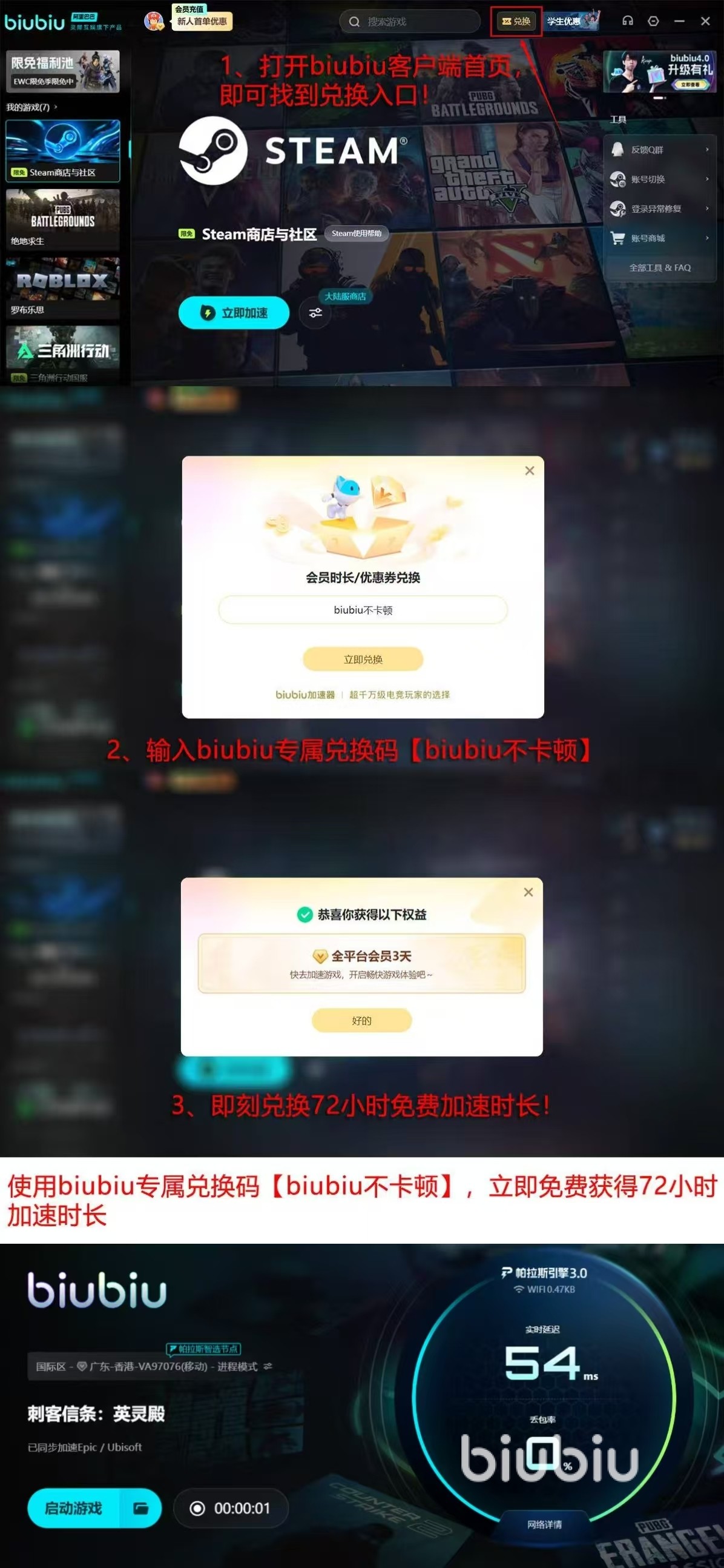 新用户注册biubiu加速器账号即可获得24小时全功能免费试用权限。输入专属兑换码【biubiu不卡顿】还可额外领取72小时加速时长,充分验证其在开放世界探索、快速旅行加载、多人合作突袭等典型场景下的稳定性表现。无论是在英格兰旷野中纵马驰骋,还是于约顿海姆冰川间追踪线索,流畅稳定的连接与帧率输出,将切实保障每一次维京征途的完整性与沉浸感。