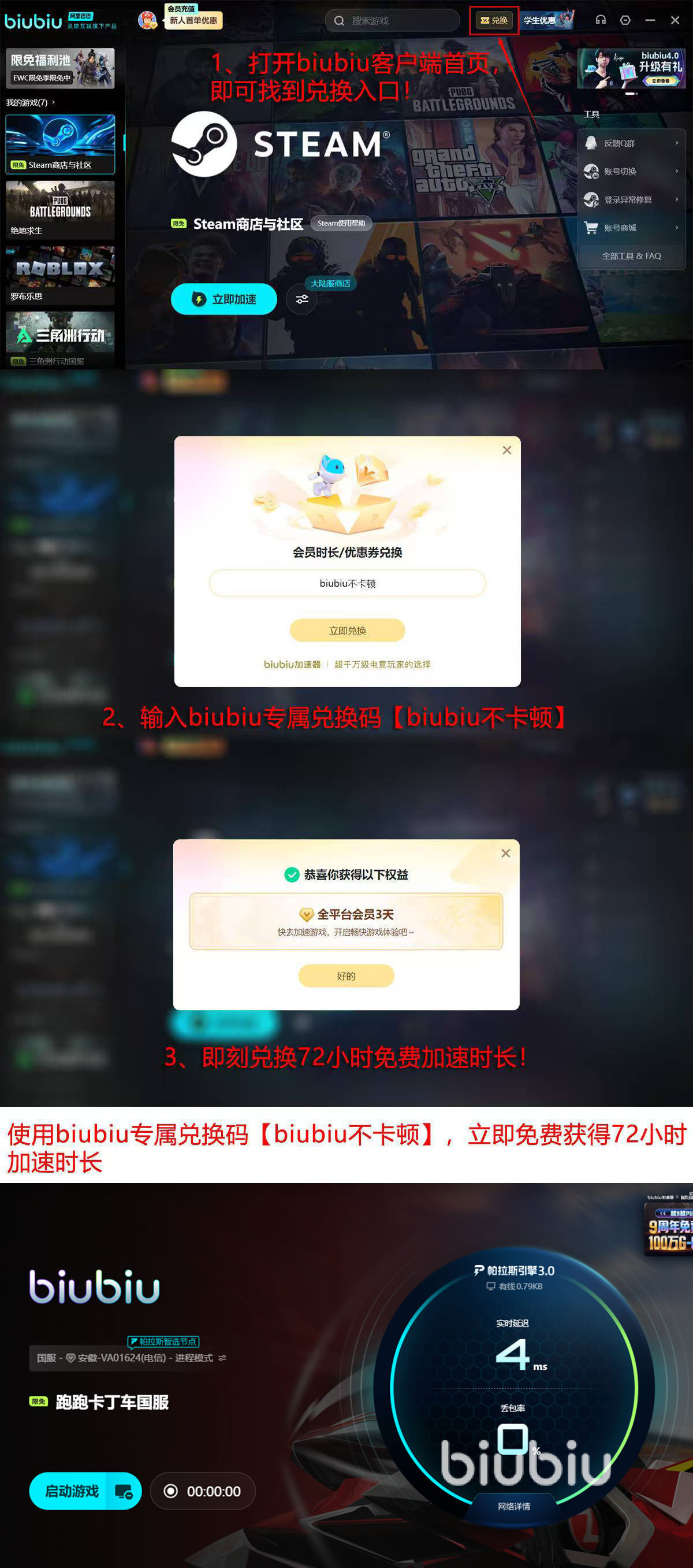 对于《跑跑卡丁车》这类对网络时延敏感度极高的竞速游戏,采用专业加速方案是成本最低、见效最快的解决方案。新用户注册即可获赠24小时免费加速时长;进入APP首页点击“兑换”,输入口令【biubiu不卡顿】,还可额外领取72小时,总计享96小时全功能体验。